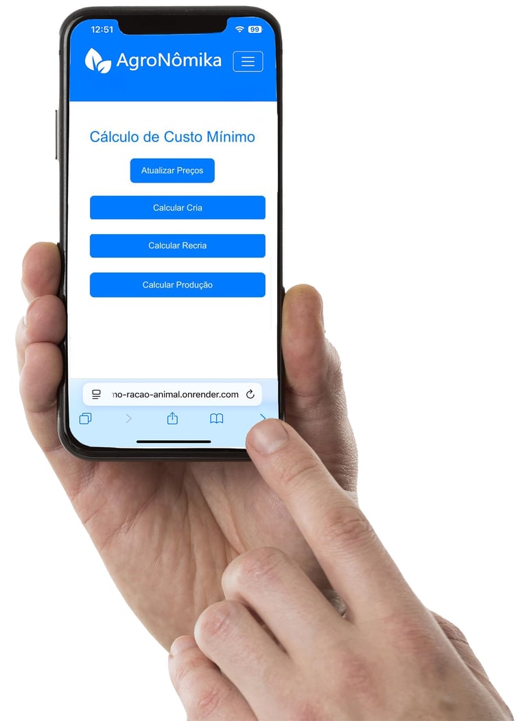 Desenvolvido para atender produtores de todos os tamanhos, nosso App não exige equipamentos caros para sua adoção, nem conhecimento técnico avançado para sua operação. Com apenas um celular ou computador, o produtor formula, em poucos cliques, rações balanceadas, totalmente adaptadas ao seu manejo, de forma simples, eficiente e pelo menor custo possível.